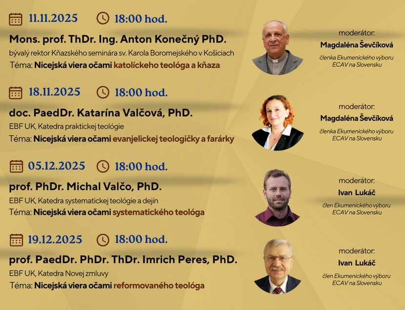 Pri tejto významnej príležitosti Vás Ekumenický výbor ECAV na Slovensku srdečne pozýva na sériu on-line večerov venovaných odkazu a aktuálnosti Nicejského koncilu pre dnešnú Cirkev a spoločnosť.
